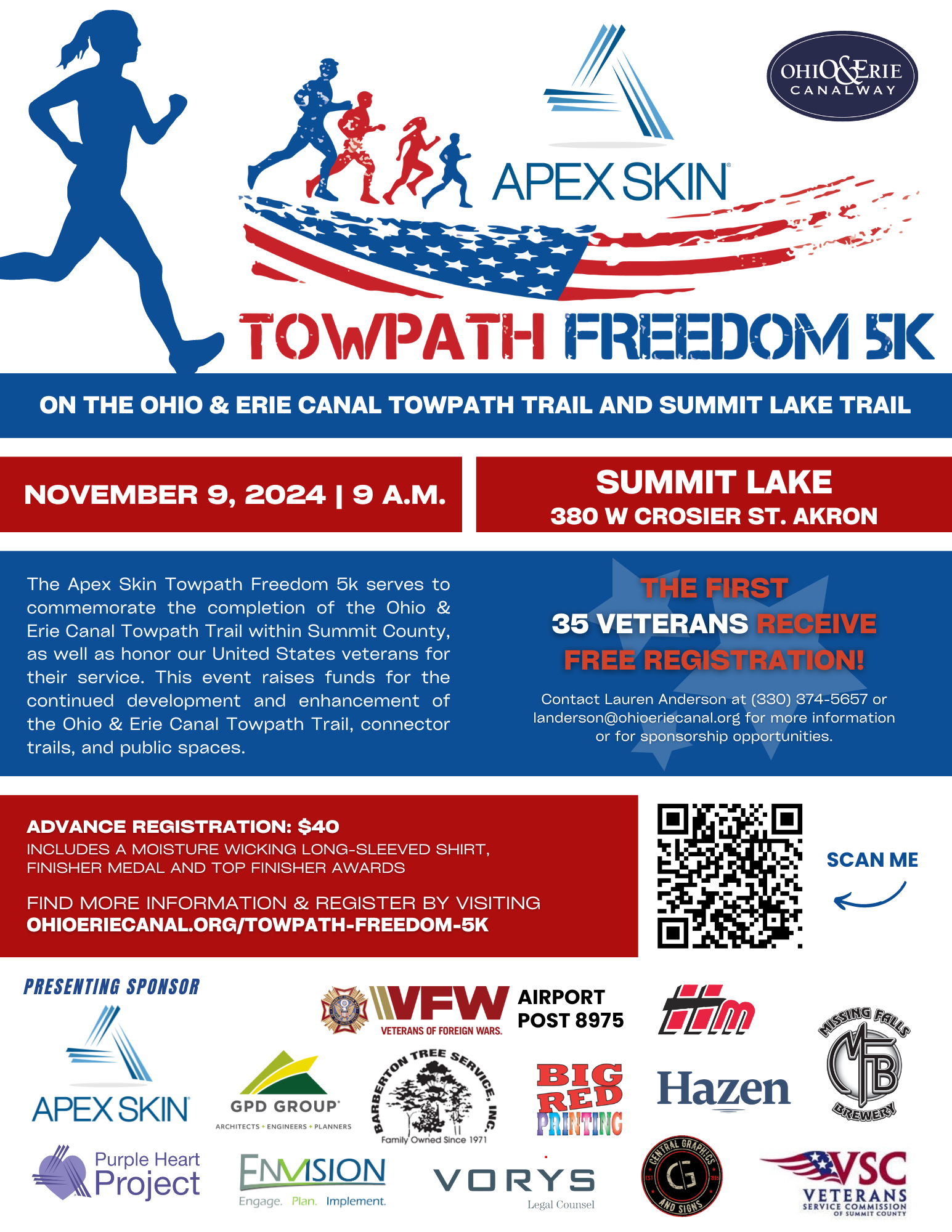 The Apex Skin Freedom 5K serves to commemorate the completion of the Ohio & Erie Canal Towpath Trail within Summit County, as well as honor our United States Veterans for their service.